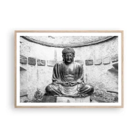 Obraz na płótnie - Czarno-biały posąg Buddy w medytacyjnej pozie - 70x100cm - U źródeł spokoju - Nowoczesna dekoracja ścienna do salonu i sypialni ARTTOR