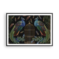 Plakat w czarnej ramie - Pawie przy złotej klatce na czarnym tle - 100x70cm - W królewskich szatach - Nowoczesna dekoracja ścienna do salonu i sypialni ARTTOR