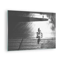 Obraz na szkle - Człowiek jadący na rowerze przez miasto, odbicie w wodzie, czarno-białe ujęcie - 70x50cm - Przed siebie, przez miasto - Nowoczesna dekoracja ścienna do salonu i sypialni ARTTOR