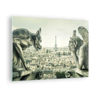 Obraz na szkle - Gargulce nad Paryżem z widokiem na Wieżę Eiffla - 70x50cm - Paryskie pogaduchy - Nowoczesna dekoracja ścienna do salonu i sypialni ARTTOR