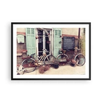 Plakat w czarnej ramie - Zabytkowe rowery przed drewnianymi drzwiami z pastelowymi okiennicami - 70x50cm - Niech żyje prowincja - Nowoczesna dekoracja ścienna do salonu i sypialni ARTTOR