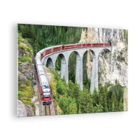 Obraz na szkle - Pociąg na tle górskiego mostu wśród zielonych krajobrazów - 120x80cm - Kolej na górskie widoki - Nowoczesna dekoracja ścienna do salonu, kuchni i sypialni ARTTOR