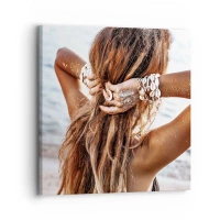 Obraz na płótnie - Kobieta na plaży z długimi włosami i bransoletkami z muszli - 50x70cm - Siostra wody i słońca - Nowoczesna dekoracja ścienna do salonu, kuchni i sypialni ARTTOR