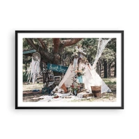 Plakat w czarnej ramie - Dekoracja boho z tipi w lesie - 70x50cm - Make love… - Nowoczesna dekoracja ścienna do salonu i sypialni ARTTOR