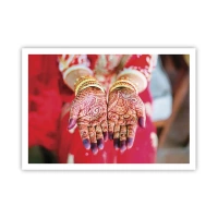 Obraz na szkle - Dłonie z henną w tradycyjnym stroju na tle czerwieni - 100x70cm - Gotowa złapać szczęście - Nowoczesna dekoracja ścienna do salonu, kuchni i sypialni ARTTOR