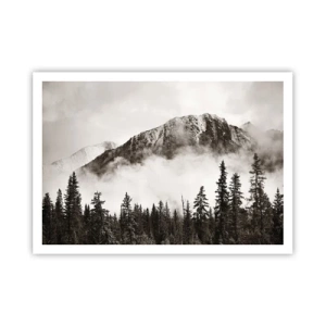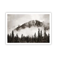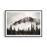 Plakat w czarnej ramie - Malowniczy szczyt górski otoczony mgłą i lasem w odcieniach sepia - 100x70cm - Granitowy władca - Nowoczesna dekoracja ścienna do salonu i sypialni ARTTOR
