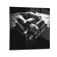 Obraz na szkle - Dłonie splecione na gitarze w monochromatycznej tonacji - 70x100cm - Modlitwa artysty - Nowoczesna dekoracja ścienna do salonu i sypialni ARTTOR