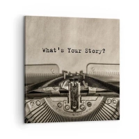 Obraz na płótnie - Maszyna do pisania z napisem What’s Your Story? - 70x100cm - Opowiedz mi - Nowoczesna dekoracja ścienna do salonu i sypialni ARTTOR