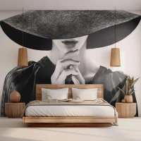 Fototapeta Premium Canvas - Stylowa kobieta w dużym kapeluszu w odcieniach czerni i bieli - 100x70cm - Skryte piękno - Nowoczesna dekoracja ścienna do salonu i sypialni ARTTOR
