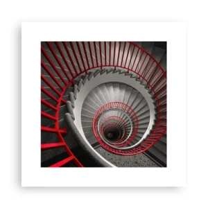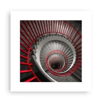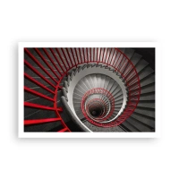 Plakat - Spiralne schody z czerwonymi poręczami w dynamicznej perspektywie - 100x70cm - Zabawy architektury - Nowoczesna dekoracja ścienna do salonu i sypialni ARTTOR