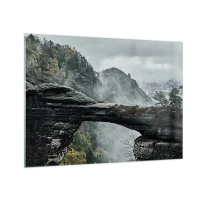 Obraz na szkle - Kamienny most wśród mglistych gór i leśnego krajobrazu - 70x50cm - Zaraz się zacznie przygoda - Nowoczesna dekoracja ścienna do salonu i sypialni ARTTOR