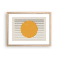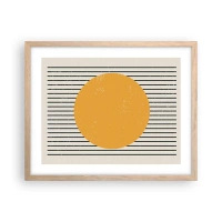 Plakat w czarnej ramie - Żółte koło na tle czarno-białych poziomych linii - 100x70cm - Siła prostoty - Nowoczesna dekoracja ścienna do salonu i sypialni ARTTOR