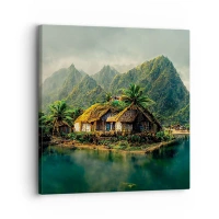 Obraz na szkle - Tropikalna wioska nad wodą w otoczeniu gór i palm - 50x70cm - Tropikalny raj - Nowoczesna dekoracja ścienna do salonu, kuchni i sypialni ARTTOR