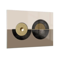 Obraz na szkle - Geometryczne koła w złocie i czerni na beżowym tle - 100x70cm - Wariacje wokół koła - Nowoczesna dekoracja ścienna do salonu, kuchni i sypialni ARTTOR