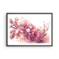 Plakat w czarnej ramie - Delikatne kwiaty wiśni w pełnym rozkwicie na jasnym tle - 70x50cm - Kwiat kwitnącej wiśni - Nowoczesna dekoracja ścienna do salonu i sypialni ARTTOR