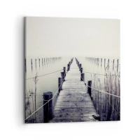 Obraz na płótnie - Drewniany pomost prowadzący w mglistą przestrzeń - 100x70cm - Zanurz się w spokoju - Nowoczesna dekoracja ścienna do salonu, kuchni i sypialni ARTTOR