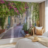 Fototapeta Standard Eco - Urokliwa uliczka z kwitnącymi pnączami i kawiarniami - 100x70cm - Kwitnący zaułek - Nowoczesna dekoracja ścienna do salonu i sypialni ARTTOR