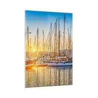Obraz na szkle - Zachód słońca nad mariną pełną żaglówek - 80x120cm - Wiatr też musi spać - Nowoczesna dekoracja ścienna do salonu i sypialni ARTTOR