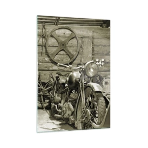 Obraz na szkle - Warsztat z zabytkowymi narzędziami i starym motocyklem - 50x70cm - W szopie wuja Władka - Nowoczesna dekoracja ścienna do salonu, kuchni i sypialni ARTTOR