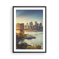 Plakat w czarnej ramie - Most Brookliński i panorama Manhattanu o zmierzchu - 50x70cm - Wielkomiejski świt - Nowoczesna dekoracja ścienna do salonu i sypialni ARTTOR