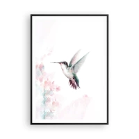 Obraz na szkle - Koliber w delikatnych pastelowych barwach na tle kwiatów - 70x100cm - Zatrzymany w trzepocie - Nowoczesna dekoracja ścienna do salonu i sypialni ARTTOR