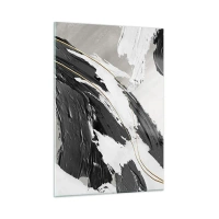 Obraz na szkle - Dynamiczne pociągnięcia czerni i bieli ze złotym akcentem - 50x70cm - Abstrakcja z rozmachem - Nowoczesna dekoracja ścienna do salonu, kuchni i sypialni ARTTOR