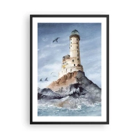 Plakat w czarnej ramie - Akwarela przedstawiająca latarnię morską na skalistym wybrzeżu - 50x70cm - Niezwyciężona - Nowoczesna dekoracja ścienna do salonu i sypialni ARTTOR