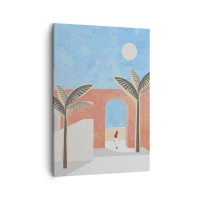 Obraz na płótnie - Minimalistyczna ilustracja architektury z palmami w pastelowych kolorach - 50x70cm - Arabski dzień - Nowoczesna dekoracja ścienna do salonu, kuchni i sypialni ARTTOR