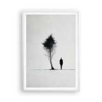 Obraz na szkle - Minimalistyczna sylwetka człowieka obok drzewa na białym tle - 70x100cm - Wszyscy wędrujemy - Nowoczesna dekoracja ścienna do salonu i sypialni ARTTOR