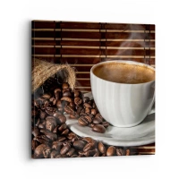 Zegar ścienny - Filiżanka kawy z ziarnami na tle bambusowym - 30x30cm - Czarność węgla, przejrzystość bursztynu - Nowoczesna dekoracja ścienna do salonu i sypialni ARTTOR