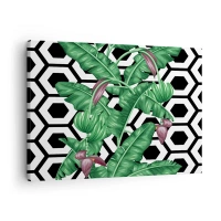 Fototapeta Premium Canvas - Tropikalne liście na geometrycznym tle - 100x70cm - Kompozycja symetryczna z natury - Nowoczesna dekoracja ścienna do salonu i sypialni ARTTOR