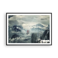 Plakat w czarnej ramie - Tajemniczy krajobraz z zamkiem, górami i statkiem - 100x70cm - Na magicznych wodach - Nowoczesna dekoracja ścienna do salonu i sypialni ARTTOR