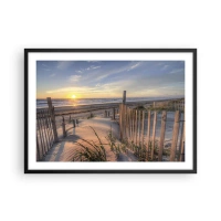 Plakat w czarnej ramie - Plaża o zachodzie słońca z drewnianym ogrodzeniem - 70x50cm - Blask i cień wiatru - Nowoczesna dekoracja ścienna do salonu i sypialni ARTTOR