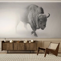 Fototapeta Premium Sand - Czarno-biały wizerunek bizona w otoczeniu mgły - 100x70cm - Król prerii - Nowoczesna dekoracja ścienna do salonu, kuchni i sypialni ARTTOR