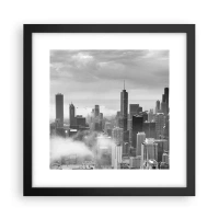 Zegar ścienny - Czarno-biała panorama miasta z drapaczami chmur i mgłą - 30x30cm - Pejzaż amerykański - Nowoczesna dekoracja ścienna do salonu, kuchni i sypialni ARTTOR