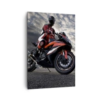 Obraz na płótnie - Motocyklista na sportowym motocyklu na tle pochmurnego nieba - 70x100cm - Mroczny jeździec - Nowoczesna dekoracja ścienna do salonu i sypialni ARTTOR