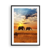 Plakat w czarnej ramie - Słonie wędrujące w blasku zachodzącego słońca - 50x70cm - Rodzinna przechadzka - Nowoczesna dekoracja ścienna do salonu i sypialni ARTTOR