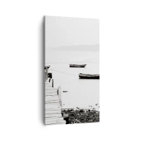 Obraz na płótnie - Drewniany pomost i łodzie na spokojnej tafli jeziora w czerni i bieli - 50x70cm - Nad wodą cichą i czystą - Nowoczesna dekoracja ścienna do salonu, kuchni i sypialni ARTTOR