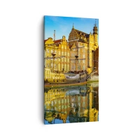 Obraz na płótnie - Widok na kolorowe kamienice i żaglowiec odbite w wodzie - 50x70cm - Lustrzane odbicie przeszłości - Nowoczesna dekoracja ścienna do salonu, kuchni i sypialni ARTTOR