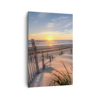 Obraz na płótnie - Plaża o zachodzie słońca z drewnianym ogrodzeniem - 80x120cm - Blask i cień wiatru - Nowoczesna dekoracja ścienna do salonu i sypialni ARTTOR