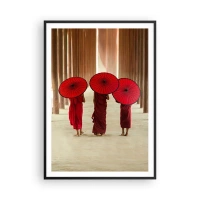 Obraz na płótnie - Trzej mnisi z czerwonymi parasolami w tradycyjnej architekturze - 70x100cm - W drodze do Czystej Krainy - Nowoczesna dekoracja ścienna do salonu i sypialni ARTTOR