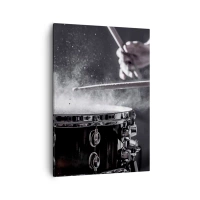 Obraz na płótnie - Bęben perkusyjny uderzany pałeczkami, z unoszącym się pyłem w czarno-białej tonacji - 50x70cm - Puls muzyki - Nowoczesna dekoracja ścienna do salonu, kuchni i sypialni ARTTOR