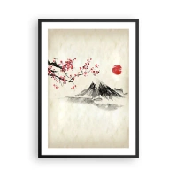 Plakat w czarnej ramie - Góra z kwitnącą gałęzią wiśni i czerwonym słońcem - 50x70cm - Pokochaj Japonię - Nowoczesna dekoracja ścienna do salonu i sypialni ARTTOR