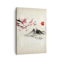 Obraz na płótnie - Tradycyjna japońska akwarela z górą, kwitnącą wiśnią i czerwonym słońcem - 50x70cm - Pokochaj Japonię - Nowoczesna dekoracja ścienna do salonu, kuchni i sypialni ARTTOR