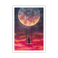 Obraz na płótnie - Postać na huśtawce zawieszonej na tle księżyca - 70x100cm - Bujać w obłokach - Nowoczesna dekoracja ścienna do salonu i sypialni ARTTOR