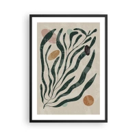 Plakat w czarnej ramie - Abstrakcyjna roślinna kompozycja w zieleni i beżu - 50x70cm - Pośród zieleni - Nowoczesna dekoracja ścienna do salonu i sypialni ARTTOR