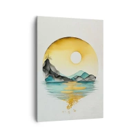 Obraz na płótnie - Akwarelowy pejzaż gór i jeziora w złotej poświacie zachodzącego słońca - 50x70cm - W kręgu piękna - Nowoczesna dekoracja ścienna do salonu, kuchni i sypialni ARTTOR
