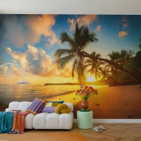 Fototapeta Premium Canvas - Plaża o zachodzie słońca z palmami nad brzegiem morza - 100x70cm - Karaibskie marzenie - Nowoczesna dekoracja ścienna do salonu i sypialni ARTTOR