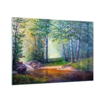Obraz na szkle - Leśny strumień otoczony drzewami w promieniach słońca - 100x70cm - Sielankowa sceneria - Nowoczesna dekoracja ścienna do salonu, kuchni i sypialni ARTTOR