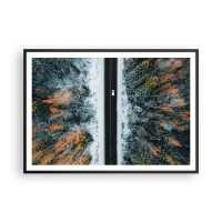 Plakat w czarnej ramie - Droga przez zimowy las widziana z lotu ptaka - 100x70cm - Przeciąć zimowy las - Nowoczesna dekoracja ścienna do salonu i sypialni ARTTOR